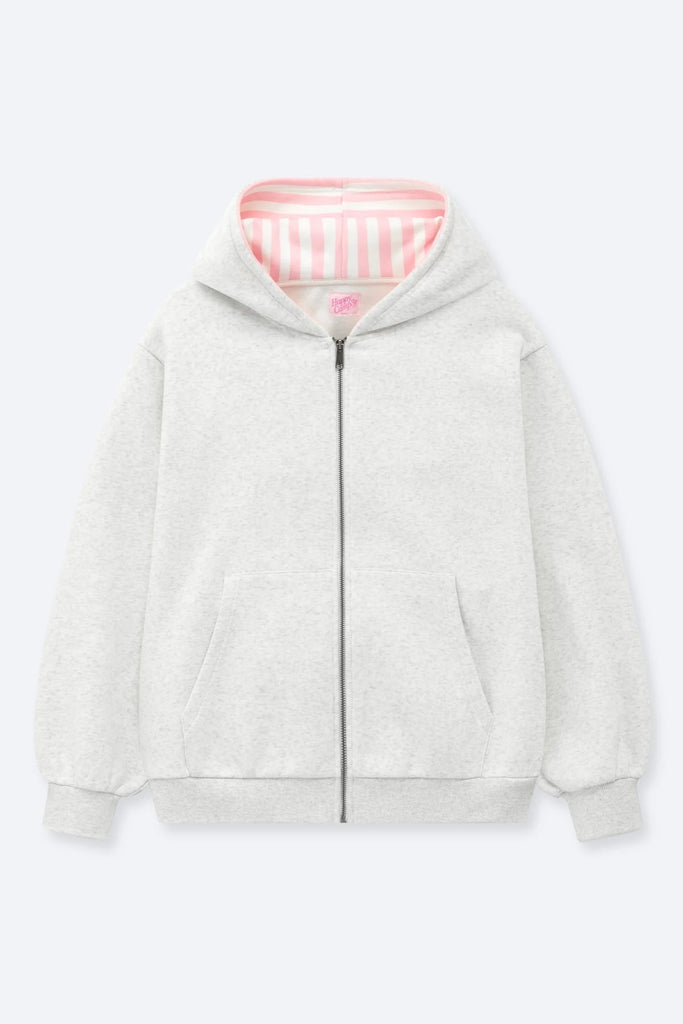 Sweet, sporty, and irresistibly soft — the Cotton Candy Stripes Zip Hoodie is your new go-to for cozy days and playful vibes. Made from plush fleece in a versatile heather grey, this full-zip hoodie features a soft pink striped hood lining and star patch sleeves for the perfect pop of personality.
