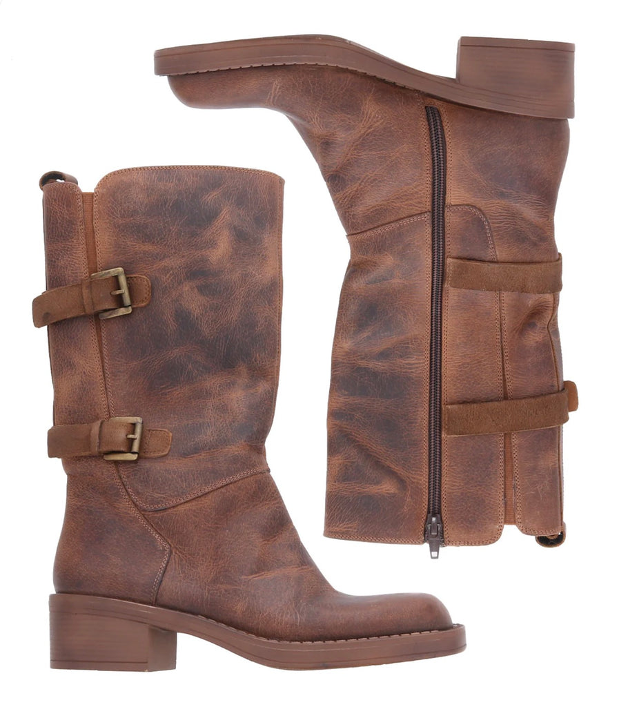 Iceberg is rugged yet refined, this mid-calf boot blends moto-inspired attitude with everyday versatility. Crafted from rich, distressed leather, it features dual side buckles for edge, a roomy round toe, and subtle stitch detailing. A hidden inner zipper and a touch of stretch gore at the top make slipping in and out effortless, while the stacked heel and grippy outsole keep every step grounded. Pair it with denim, leggings, or layers—it’s made to go wherever your day takes you.